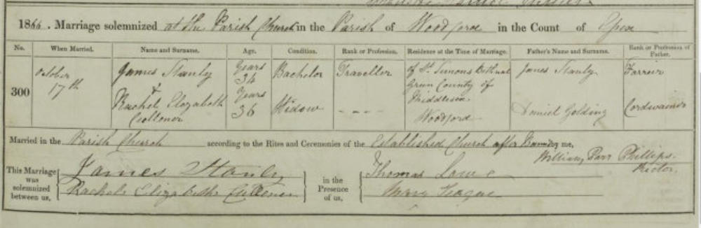 new husband was James Stanly, a bachelor aged 34, and a Traveller of St Simon’s Bethnal Green,